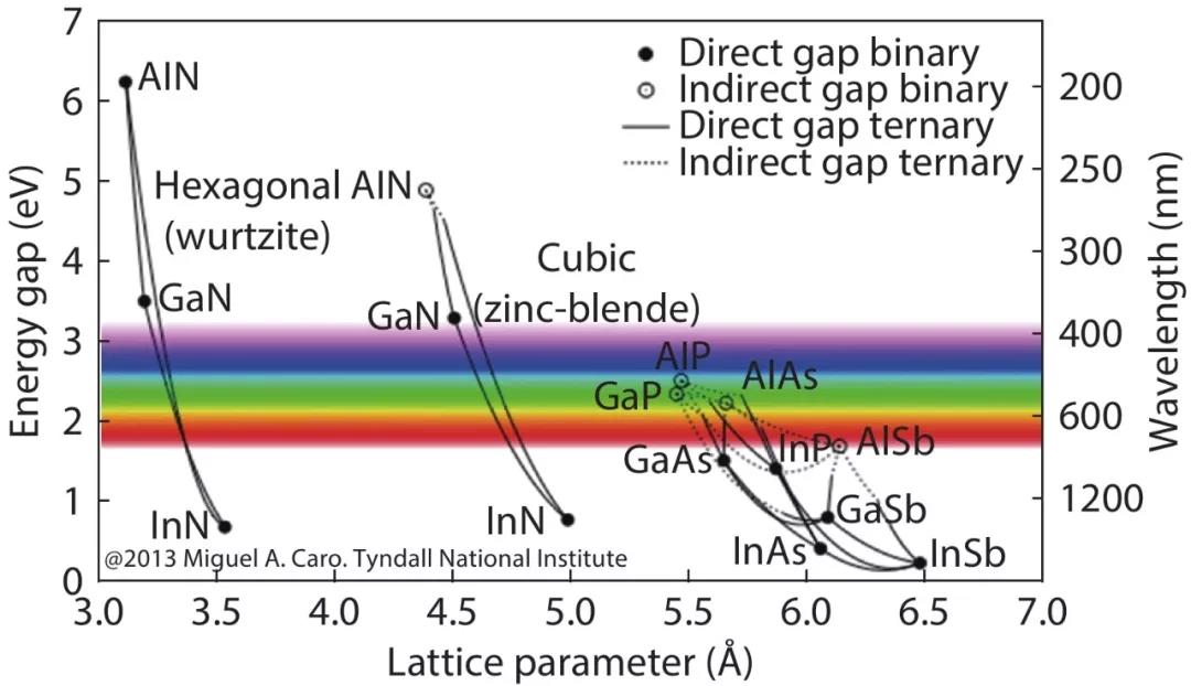 图1. III-V半导体材料体系带隙能量与晶格常数的关系