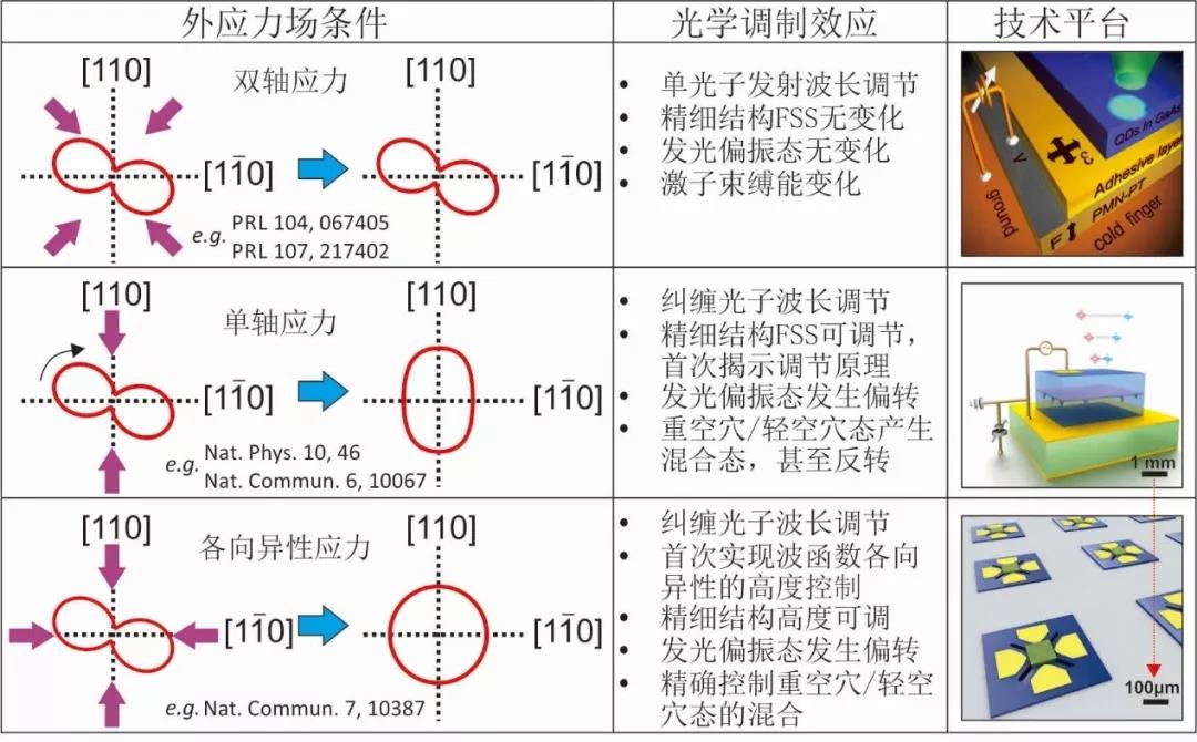 丁飞小组近几年工作的思路/主线以及主要结果总结。创造性地利用外应力场来调制单量子点的光学性质,从而解决量子点单光子源和纠缠光子源的几个主要关键挑战。利用三种不同的应力调节平台,对量子点可以施加双轴应力,单轴应力甚至是平面内可控的各向异性应力。图左的红线示意光子偏振的方向(8字型的长轴指向)以及精细结构的大小(8字型代表比较大的FSS,从而量子点不能发射纠缠光子;O字型代表FSS为零,量子点可以发射偏振纠缠光子对)。丁飞小组开创的量子点应力调节研究方向在近年来得到了同行的高度认可。