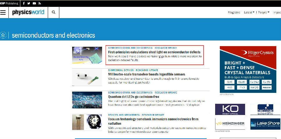 3月30日,IOP旗下新闻网站Physicsworld报道了《半导体学报》2020年第3期出版的一篇文章: He Li, Menglin Huang, Shiyou Chen. First-principles exploration of defect-pairs in GaN[J]. Journal of Semiconductors, 2020, 41(3): 032104. doi: 10.1088/1674-4926/41/3/032104 :