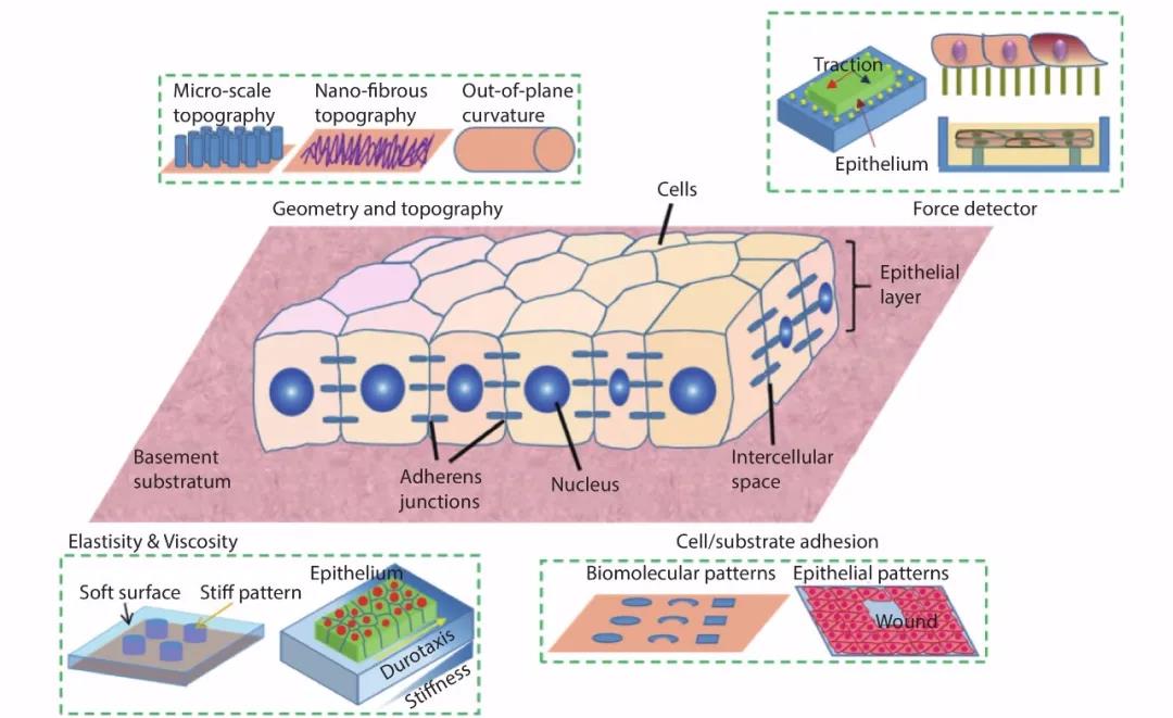图1. 用于细胞/组织力学研究的微工程合成基质。通过修改底层的特性可以调整单元和材料间的相互作用,从而改变如表面形貌、刚度和粘附性等特征。此外,可以将机械探针如牵引力显微镜和弹性微柱中的微珠等整合到基底中,以检测组织中的受力。