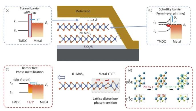 Figure 1. (Color online) Electrical interface between 2H TMDC and metal lead. (a) Interface band alignment of the van der Waals contact. (b) Interface band alignment of the Schottky-limited contact due to the presence of dangling bonds at the TMDC edge. (c) Interface band alignment of the contact based on the 1T–2H interface through locally induced phase transition. (d) Phase transition from 2H to 1T and 1T’.