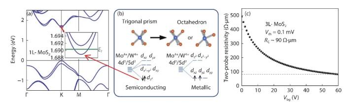 Figure 2. (Color online) (a) Band structure of monolayer MoS2. (b) The crystal structures and corresponding energy splitting diagrams of Mo/W d-orbital states before and after the phase transition. (c) The contact resistance (measured under different gate voltages Vbg) of the 3L-MoS2 FET made by oxygen-plasma-induced phase transition.
