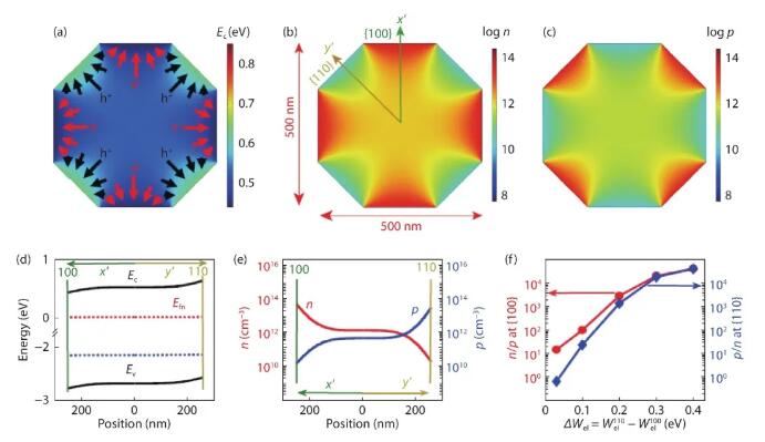 The Rh/Cr2O3 cocatalyst was found to be preferentially deposited on the (100) crystal facets, while the CoOOH cocatalyst was primarily located in the (110) direction, as illustrated in Fig. 2. The observed anisotropic deposition of cocatalysts can be attributed to a charge rectification effect inside each photocatalyst particle induced by an internal electric field, which originates from the work function difference between the respective facets. Increasing the work function difference obviously increases the extent of anisotropic charge separation, as well as the concentration of electrons at the {100} facets and of holes at the {110} facets, as seen from Fig. 3. Surface dipoles resulting from unbalanced cation/anion ratios on distinct facets may induce this work function difference even without forming junctions or composites.