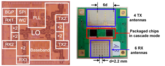 图. 清华大学课题组研发的2发3收77GHz CMOS毫米波雷达芯片和样机。