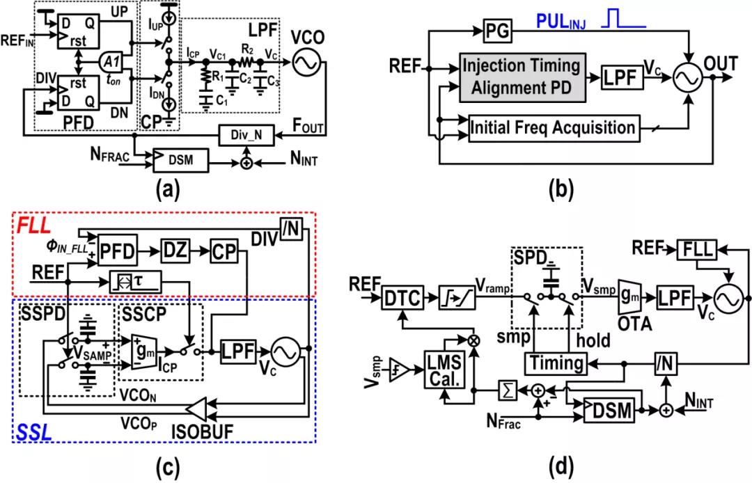 图1. 四种AMS-PLL电路结构框图:(a)CPPLL, (b) ILPLL, (c), SSPLL, (d)SPLL。