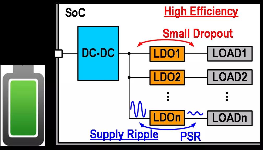 在高能效的片上系统(SoC)中,资源的高度动态分配,对电源管理的粒度提出了要求。细粒度电源管理要求每个电源域都用单独的电压稳压器供电,这要求稳压器具有全集成、低压差、中等电源抑制等特点。