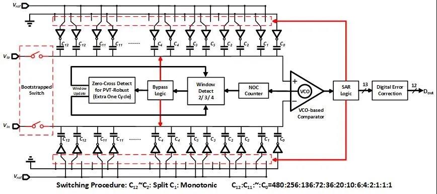 电子科技大学低功耗集成电路与系统研究所李强教授团队首先利用随机过程理论对VCO比较器的噪声特性进行了理论分析,得到闭环VCO比较器行为的解析解,发现VCO比较器会因为噪声原因而在没有达到足够多的振荡次数之前停止振荡,会降低比较器的噪声性能。VCO比较器每一个不同的振荡次数均对应一个不同的电压范围,但此对应关系对PVT敏感,自适应旁路窗技术则是通过窗宽度检测技术得到在PVT变化的情况下的合适的旁路窗,使系统可以跳过正确的逐次逼近周期数。在较高速的高精度ADC中,参考电压的变化会导致错误的输出,为了避免使用过大面积的片上去耦电容来稳定参考源,论文提出一种用于旁路窗逻辑的分裂-重组冗余算法来纠正错误的结果。