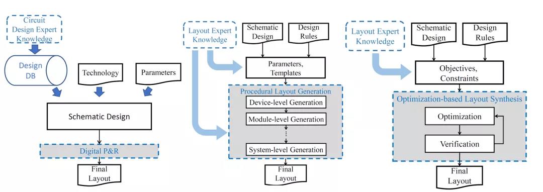 德州大学奥斯汀分校David Z. Pan课题组概述了当前的模拟/混合信号集成电路版图设计自动化方法,研究趋势以及模拟版图自动化的新愿景。文中首先回顾了三种主流的模拟集成电路布局布线方法和相关框架,包括可综合模拟电路设计、基于过程的布局布线技术、和基于优化的版图自动设计方法;然后介绍了学术界的一些最新进展,重点包括具有机器学习和统计功能的算法;最后在文中对未来EDA开发中的开放性问题和趋势提出了看法。