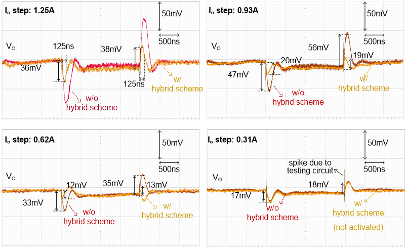 中国科学技术大学程林教授课题组提出了一种快速负载瞬态响应的补偿器,使得即使使用简单的电压型 PWM 控制模式,也可以将转换器的瞬态响应速度提高到接近理论上的最快速度,显著降低了电路的复杂度;同时在此补偿器基础上提出了一种数字线性调整器(digital linear regulator)辅助的混合控制模式(hybrid scheme),利用该技术设计了一款Buck DC-DC芯片,测试结果显示了其瞬态响应性能得到进一步的显著提高,取得了125ns/1.25A的瞬态跳变响应速度。