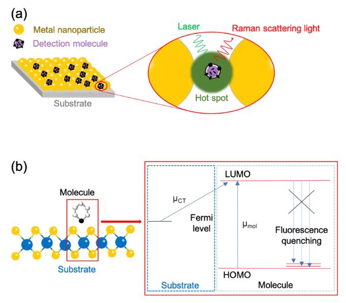 图 1. SERS机制。(a) 电磁增强机制;(b) 化学增强机制。