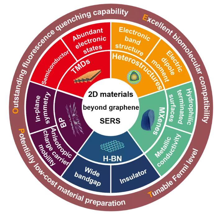 在本论文中,天津大学刘铁根教授课题组的程振洲教授和胡浩丰教授等人综述了基于非石墨烯二维材料的SERS研究进展和前沿应用成果(图2)。首先,他们介绍了“电磁增强”和“化学增强”两种SERS机制;然后,比较了过渡金属硫化物(TMDs)、黑磷(BP)、氮化硼(h-BN)和过渡金属碳化物或碳氮化物(MXenes)等五种二维材料的物理化学性质,并归纳总结了上述五种二维材料及其异质结在SERS方面的研究历史和前沿进展;最后,从增强机制、材料调控、器件开发、应用拓展等方面对基于二维材料的SERS技术进行了前瞻性展望。