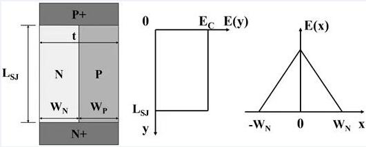 图1. (a)典型的超级结结构。(b)y方向和x方向的电场分布。