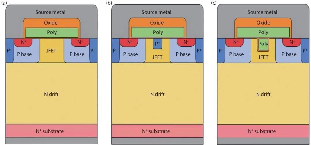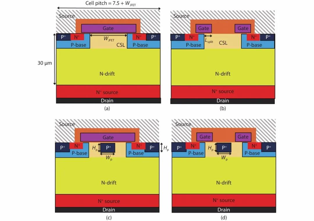 图1. MOSFET的横断面视图。(a) 平面MOSFET。(b) SG-MOSFET。(c) CIMOSFET。(d) SG-CIMOSFET。