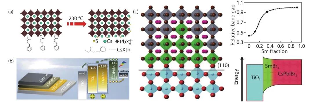 图1. (a)CsXth分解及钙钛矿中硫掺杂示意图.(b)电池的结构示意图, 以及TiO2和TiO2/CsBr ETLs的能带图.(c) SmBr3的掺杂使CsPbBr2I与TiO2之间的间隙正规化。