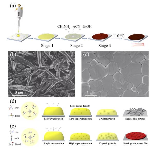 图1. (a) 滴涂工艺示意图;(b) DMF/DMSO作为溶剂制备的薄膜表面SEM图;(c) MA(EtOH)/CAN作为溶剂制备的薄膜表面SEM图;(d) 高沸点溶剂体系晶体生长过程示意图;(e) 低沸点溶剂体系晶体生长过程示意图。