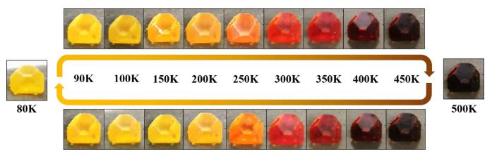 图1. Cs2NaFeCl6钙钛矿单晶在50-500K温度范围内的热致变色照片。
