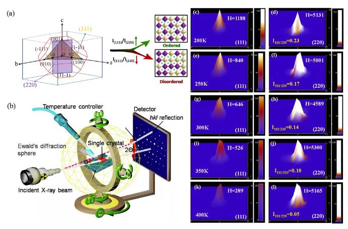 图2. (a) 面心立方钙钛矿结构中八面体有序-无序相转变示意图。(b) 原位X射线单晶衍射示意图. (c-l) Cs2NaFeCl6 钙钛矿单晶在倒易空间的衍射强度随温度的变化。