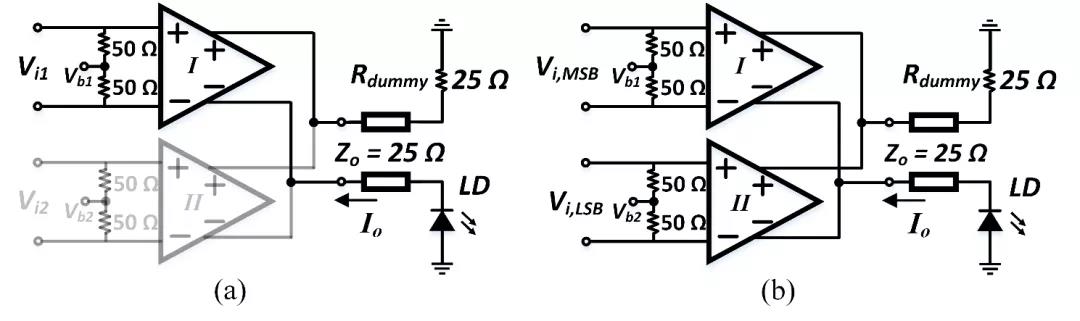 图1. 驱动电路结构。(a)15 Gbps NRZ LDD,80 mA输出电流(片I启用,片II禁用);(b)30 Gbps(15 Gbaud/s)PAM4 LDD。