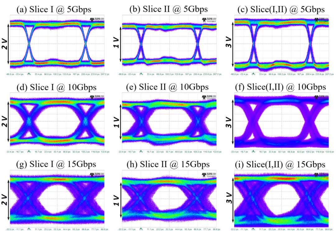 图2. 以5、10和15 Gbps速率测量的片I、片II和两个片的输出眼图。水平刻度:(a、b和c)为33.4 ps/div,(d、e和f)为16.7 ps/div,(g、h和i)为11.1 ps/div。