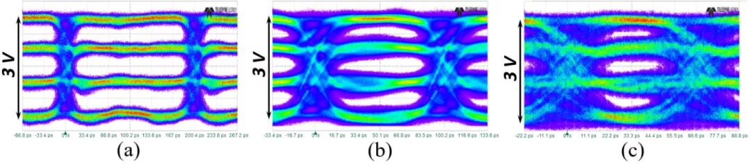 图3. 在(a)10 Gbps(5 Gbaud/s)下测得的PAM4输出眼图。(b) 20 Gbps(10 Gbaud/s)。(c) 30 Gbps(15 Gbaud/s)。水平比例尺:(a)、(b)和(c)分别为33.4、16.7和11.1 ps/div。