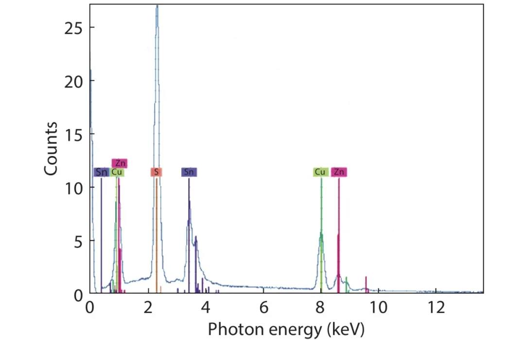 在本文中,采用熔融法生长Cu2ZnSnS4 (CZTS)铸锭,然后冷却;将得到的熔融化学计量的混合物在真空下密封在石英安瓿中。采用能谱仪(EDS)对CZTS粉末进行了化学成分分析,揭示了铸锭的微富铜和微贫锌特征。对粉末的X射线衍射(XRD)分析揭示了一种具有锌黄锡矿相的晶体结构,且具有(112)晶面的择优取向。根据XRD分析计算的a轴和c轴的晶格常数分别为a=5.40 Å,c=10.84 Å。根据室温下的霍尔测量,我们发现该晶体呈p型导电,浓度高达1018cm-3,电阻率为1.7 W cm,迁移率为10.69 cm2V-1s-1。在80–350 K的温度范围内,根据电导率与1/T的Arrhenius图测得低温和高温条件下的激活能分别为35 meV和160 meV,分别归因于复合缺陷(2CuZn+SnZn)和反位缺陷(CuZn)。所观察到的散射机制分别归因于低温和高温下的电离杂质和声学声子。提取的带隙为1.37 eV。
