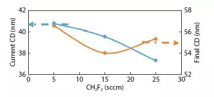 图1. 刻蚀气体CH2F2对当站SiO2掩膜版刻蚀尺寸和最后电容刻蚀尺寸的趋势关联图。