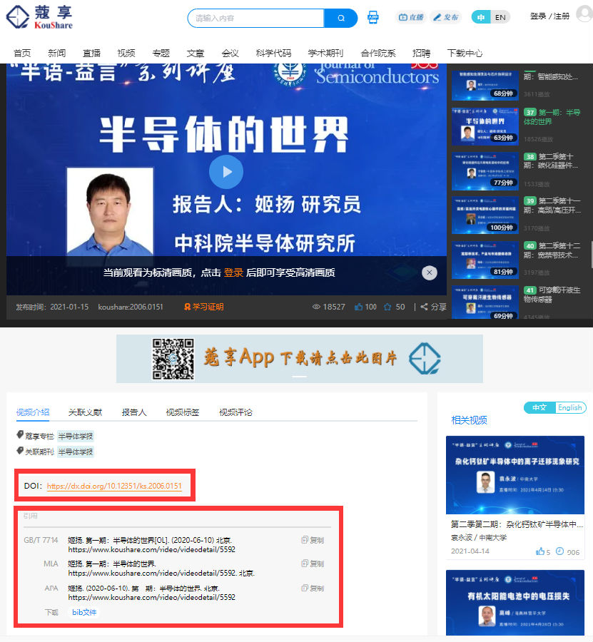《半导体学报》主办的“半语-益言”系列直播讲座的所有报告,均已赋予DOI号码,并提供了多种引用格式。在报告回放页面可以看到DOI及引用格式,如图:
