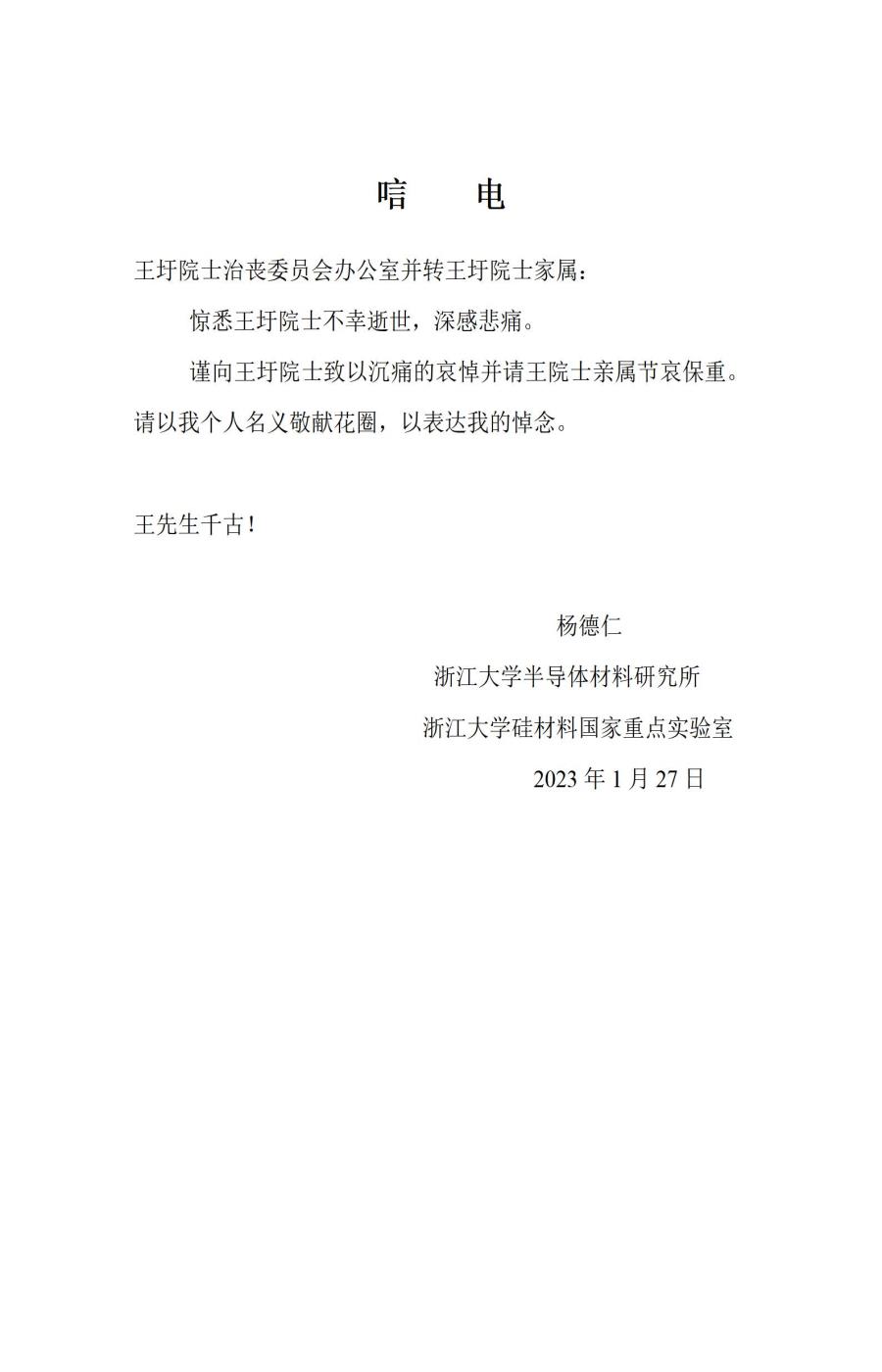 浙江大学杨德仁院士 唁电