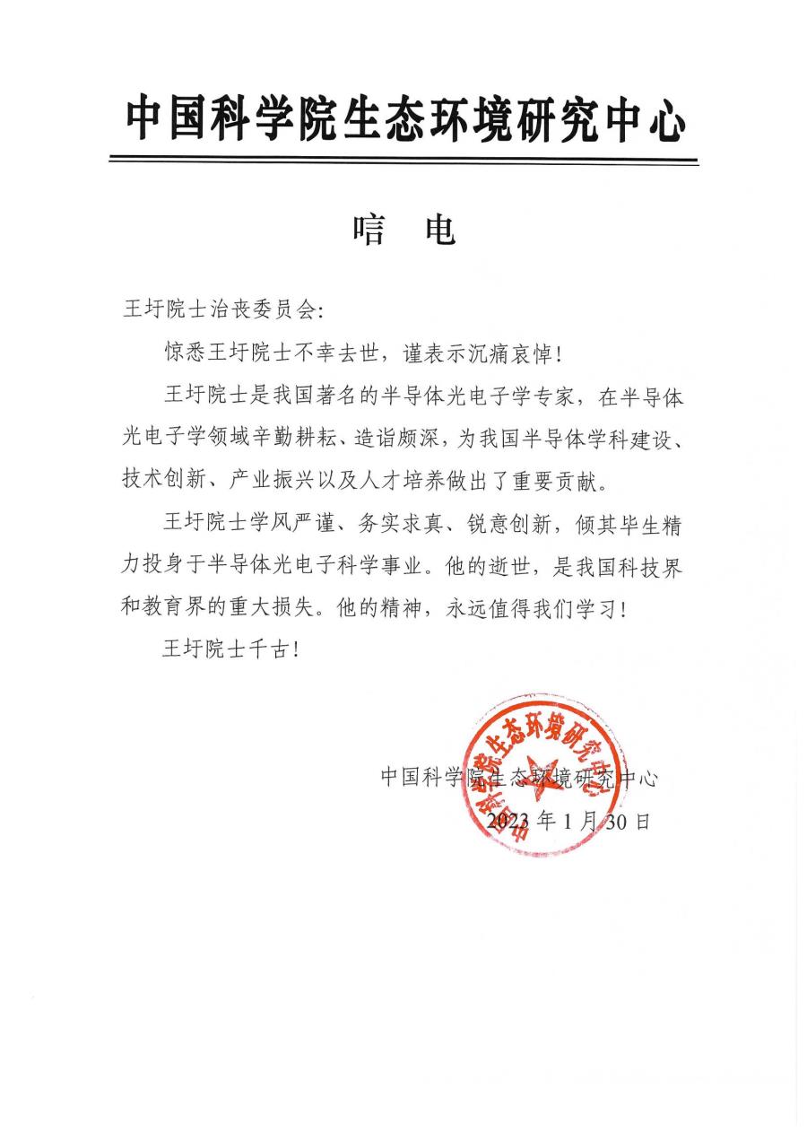中国科学院生态环境研究中心 唁电