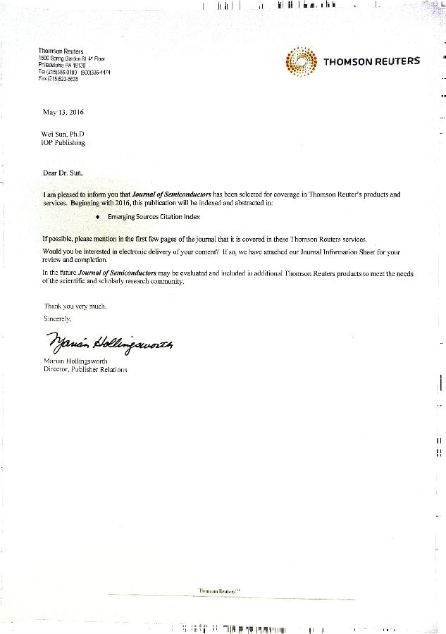 | 接汤森路透公司通知:《半导体学报》(Journal of Semiconductors)自2016年起被ESCI收录。