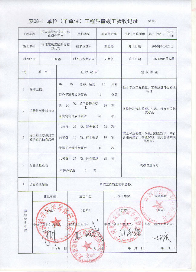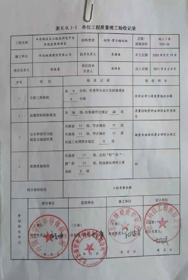 根据竣工验收要求,由参会各单位专业人员组成建安专业、水暖通风专业、电气专业组验收小组,我单位曹锋同志任组长。验收组听取了参建各方工程建设情况总结和质量评价,对工程建设情况进行现场查验,认为半导体技术工程化研究平台项目建设内容和施工质量达到了验收标准,同意竣工验收。质监站代表认为竣工验收专家资质能力满足验收要求、验收会议组织程序合法有效,同意通过竣工验收。