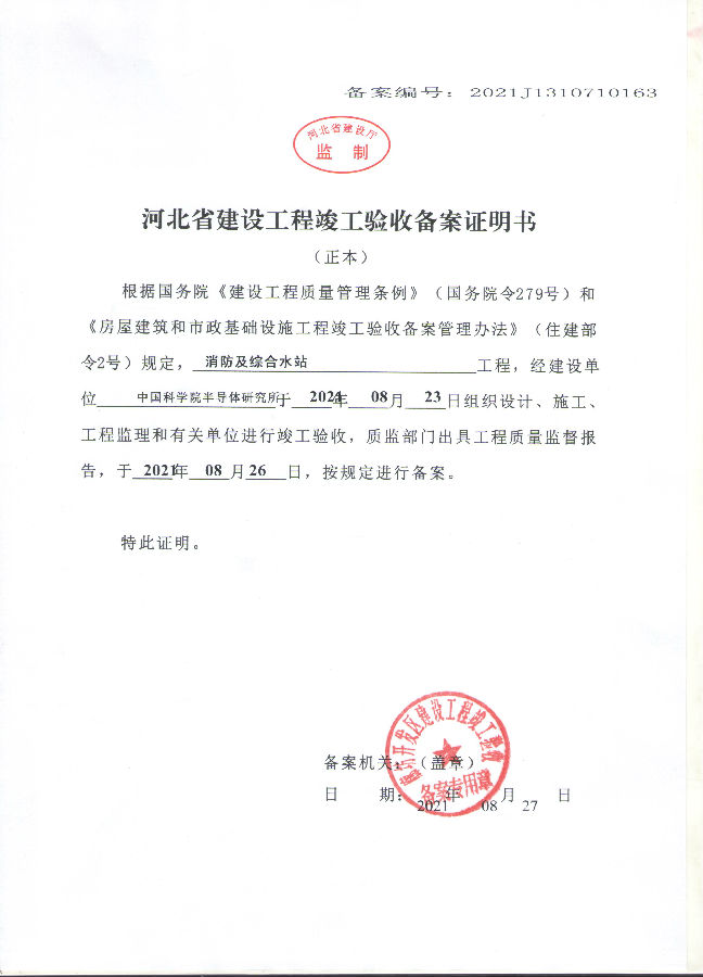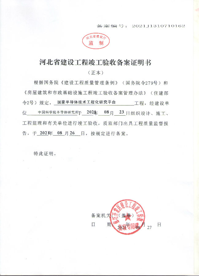 2021年9月1日,本项目顺利通过廊坊市经济开发区建设局竣工验收备案,取得竣工备案证明书。现半导体技术工程化研发平台项目已具备合法使用条件,欢迎科学家们尽快到廊坊园区开展工作,廊坊办全体职工将竭诚为大家做好支撑服务!